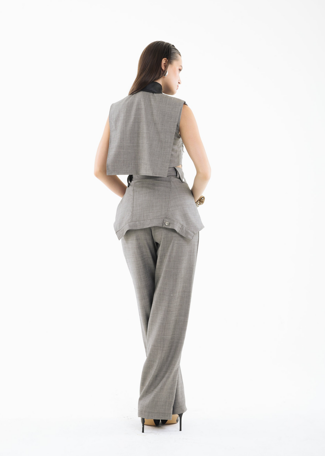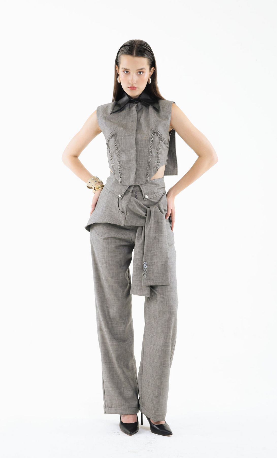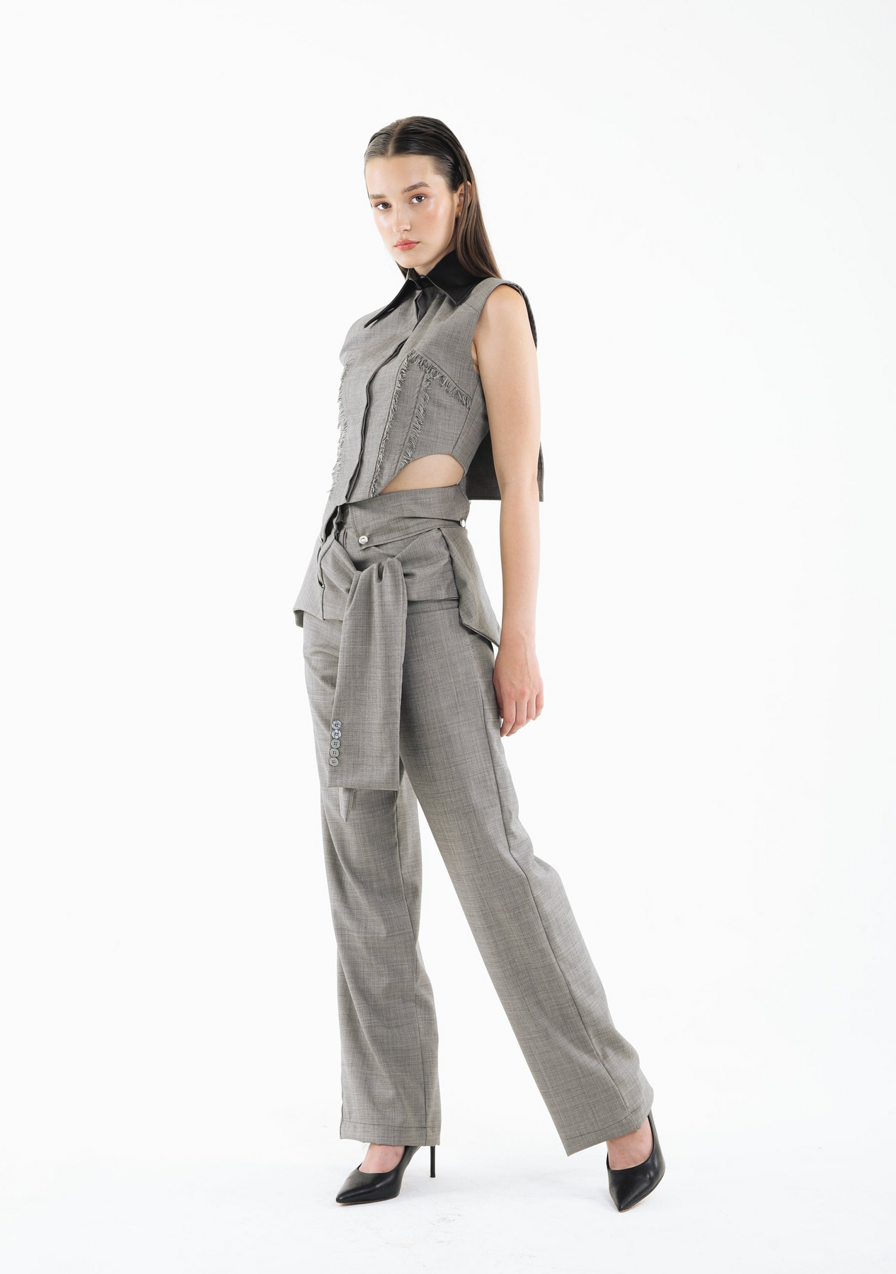 The KNOT THEORY PANTS are tailored with a refined, elongated silhouette that subtly grazes the floor for an effortlessly polished finish. A wide sash wraps gracefully around the waist, creating soft draping that adds movement and a touch of sculptural elegance. Clean lines and fluid construction make this piece a modern essential with unmistakable sophistication.