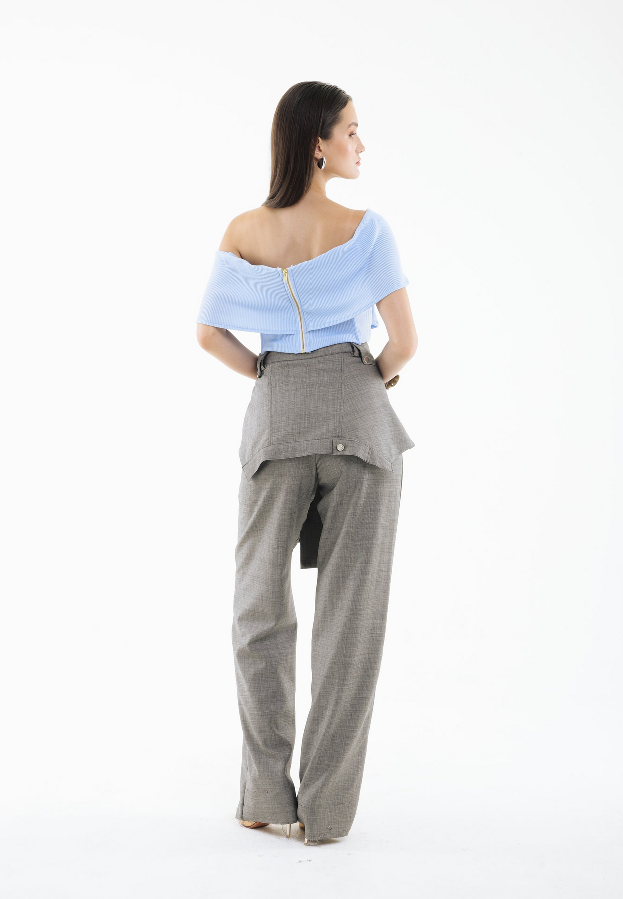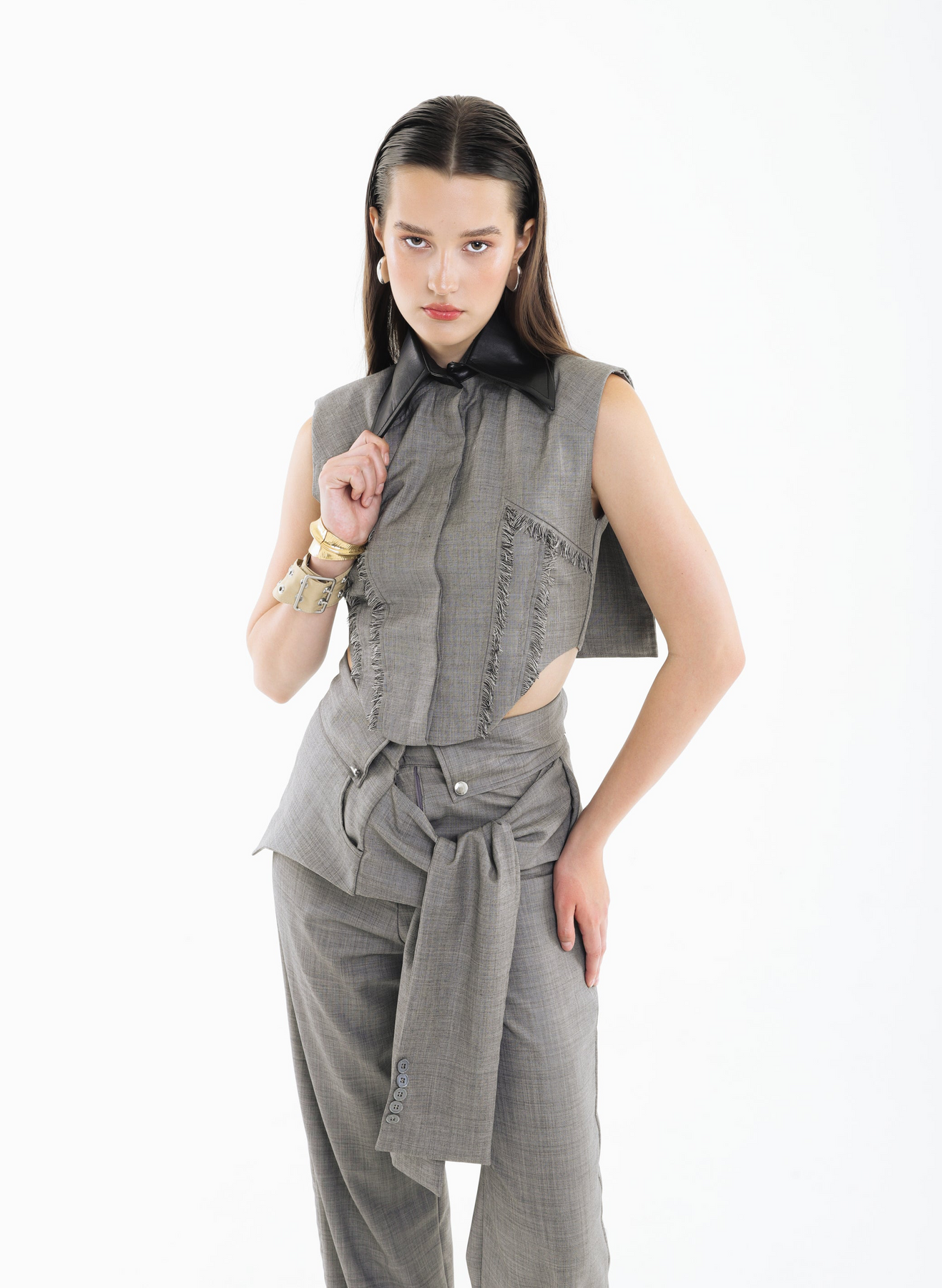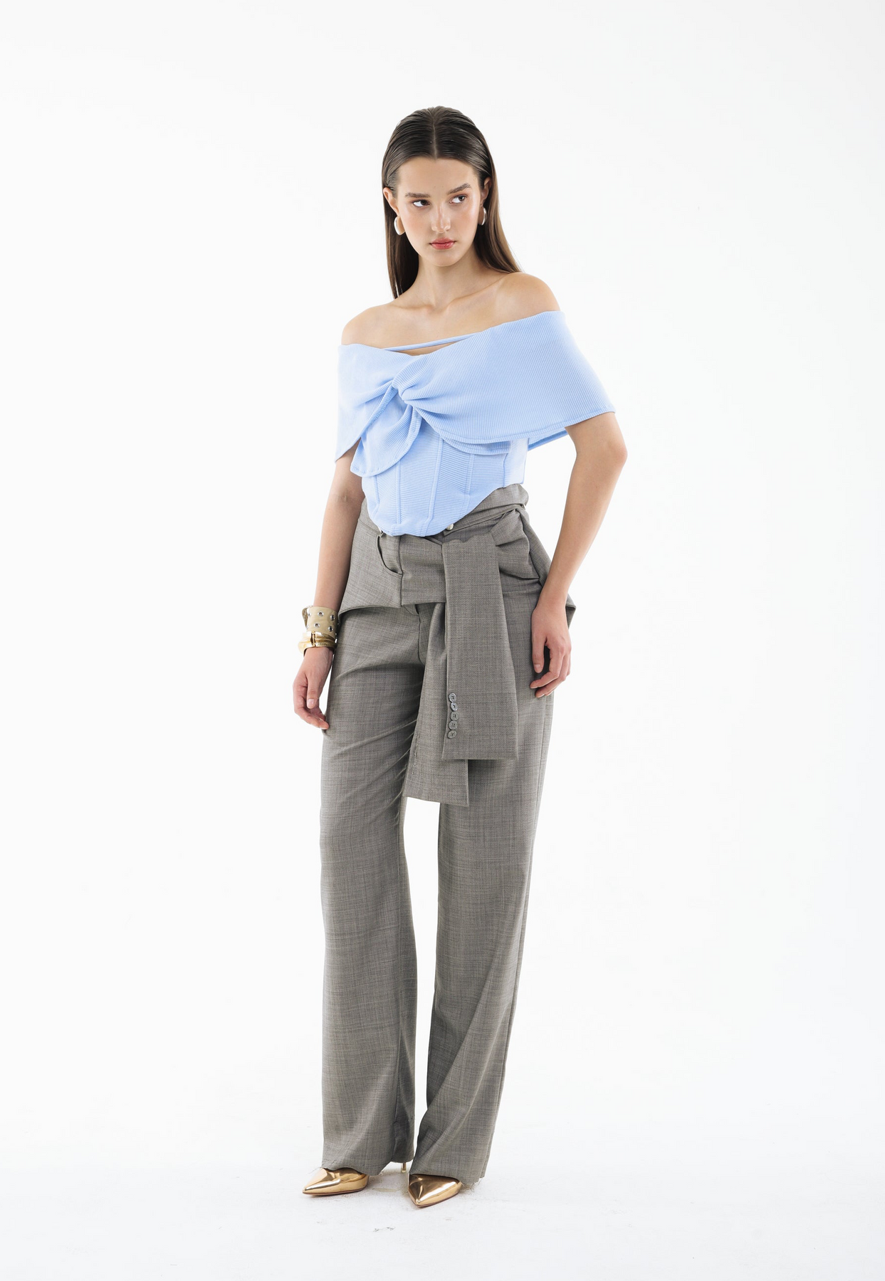 The KNOT THEORY PANTS are tailored with a refined, elongated silhouette that subtly grazes the floor for an effortlessly polished finish. A wide sash wraps gracefully around the waist, creating soft draping that adds movement and a touch of sculptural elegance. Clean lines and fluid construction make this piece a modern essential with unmistakable sophistication.