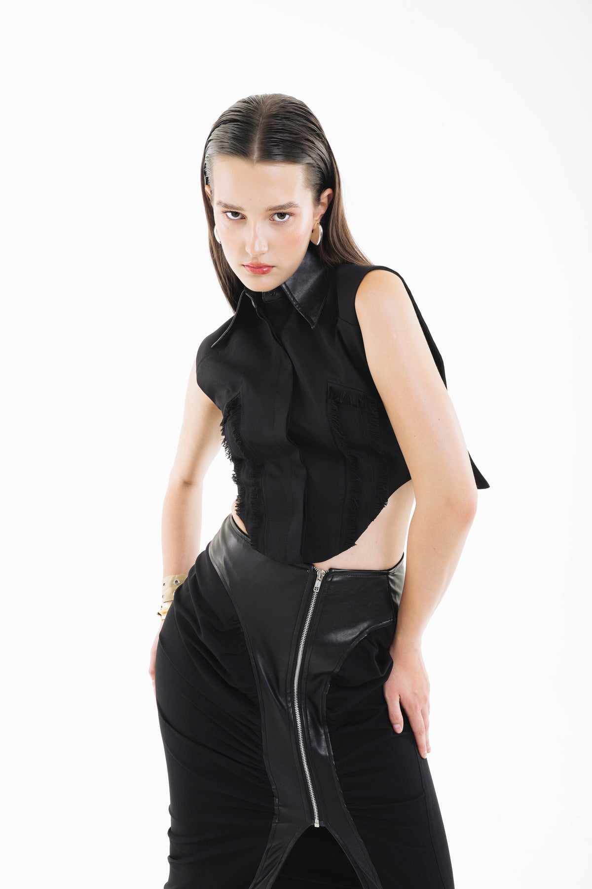 Clean, crisp, and architectural, the VORTEX SHIRT reimagines classic shirting through precise paneling and a sharply tailored collar. The cutaway sides introduce a modern, unexpected contour while maintaining a polished, minimalist refinement. Sleek seam detailing enhances the elongated silhouette, giving the piece a contemporary, gallery-like sophistication.