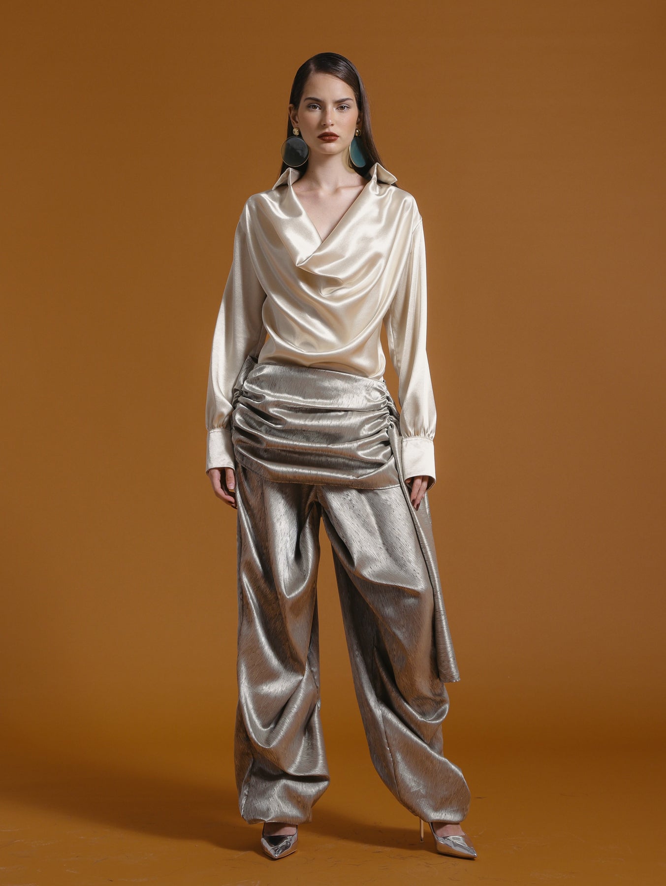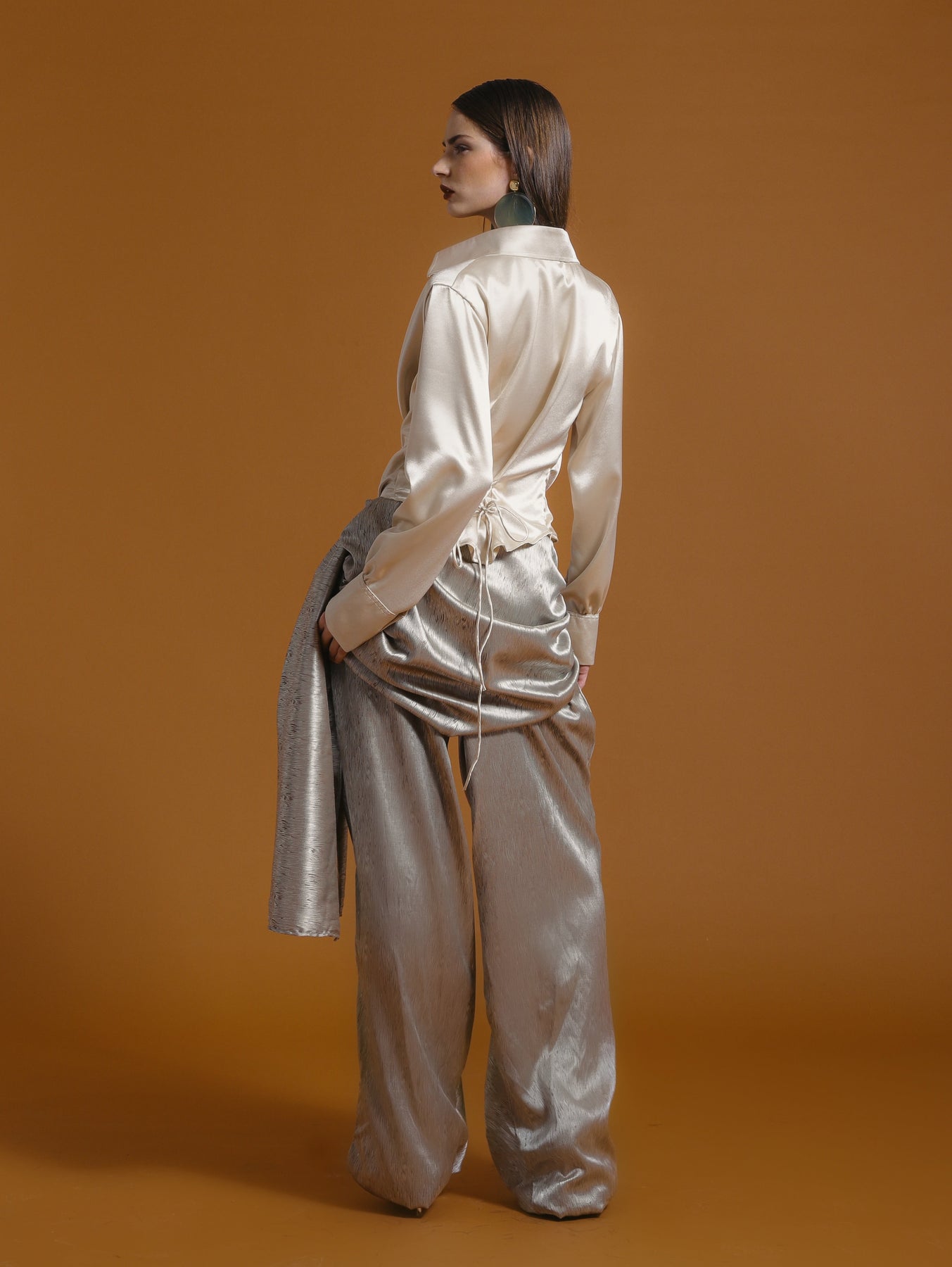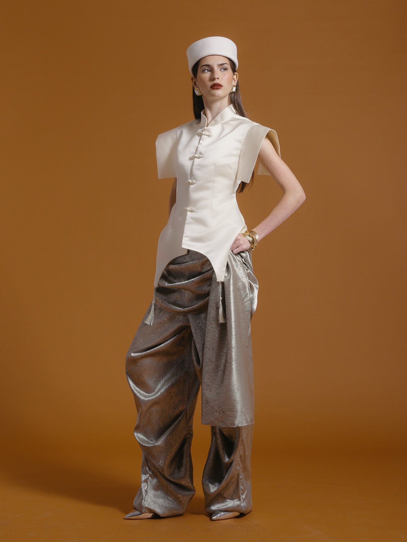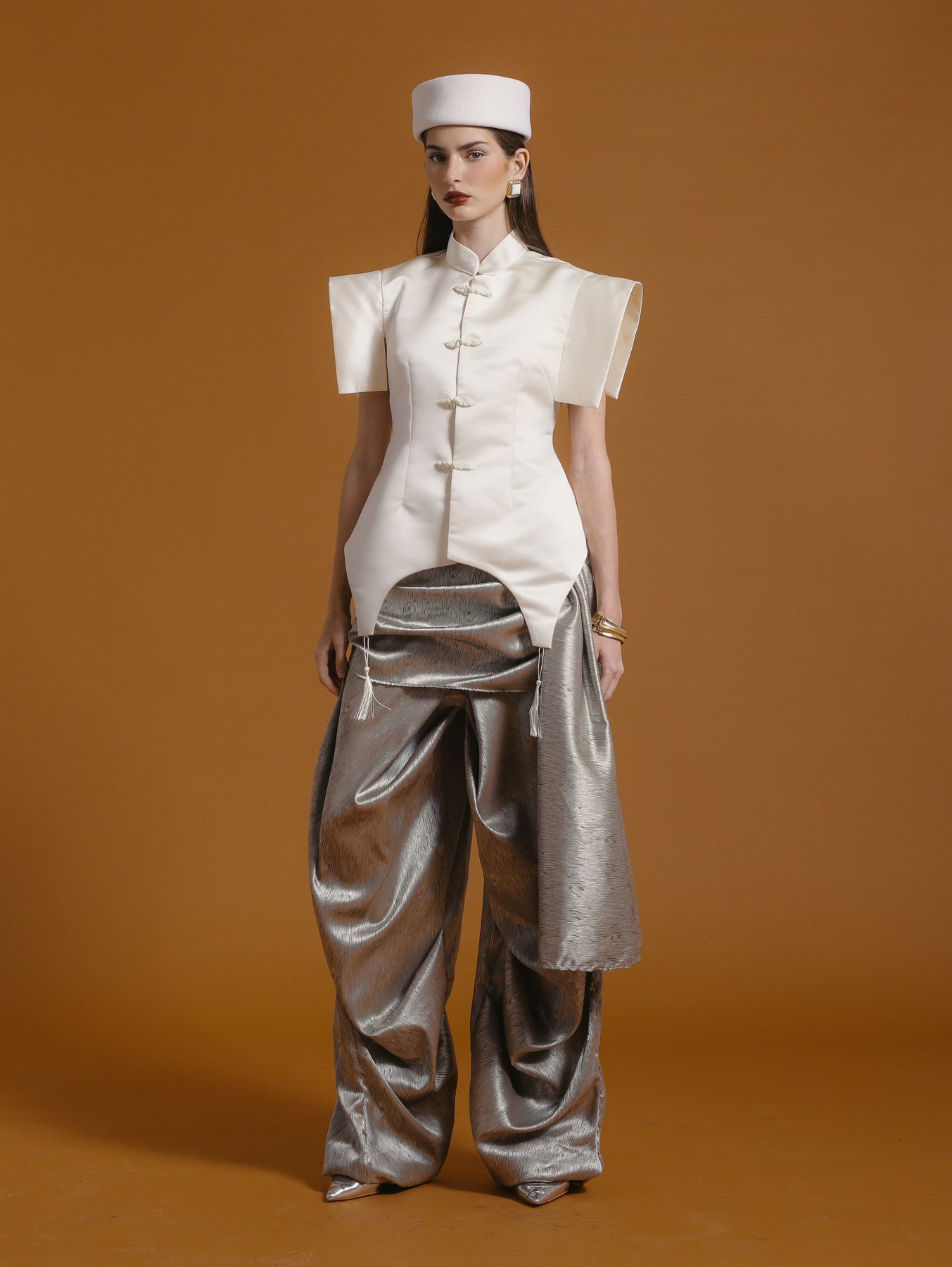 Trousers with intentional draping that creates fluid movement. The flowing lines symbolize abundance and ease, central themes of Lunar New Year celebration.