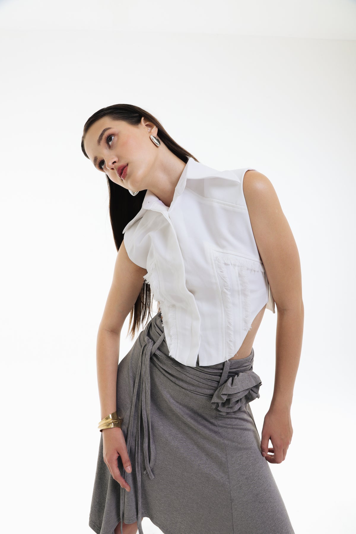 Clean, crisp, and architectural, the VORTEX SHIRT reimagines classic shirting through precise paneling and a sharply tailored collar. The cutaway sides introduce a modern, unexpected contour while maintaining a polished, minimalist refinement. Sleek seam detailing enhances the elongated silhouette, giving the piece a contemporary, gallery-like sophistication.