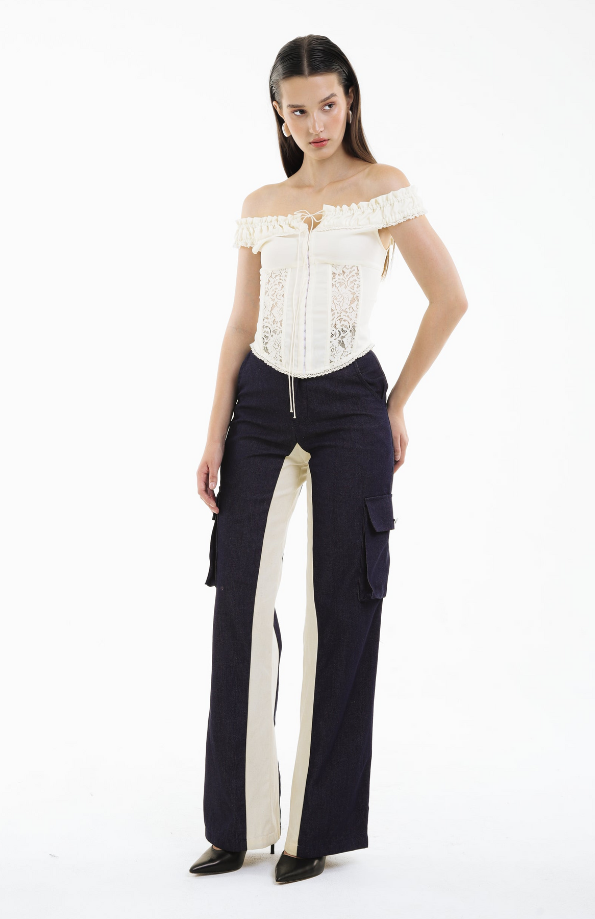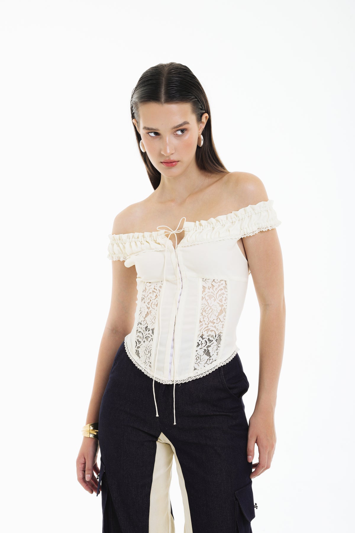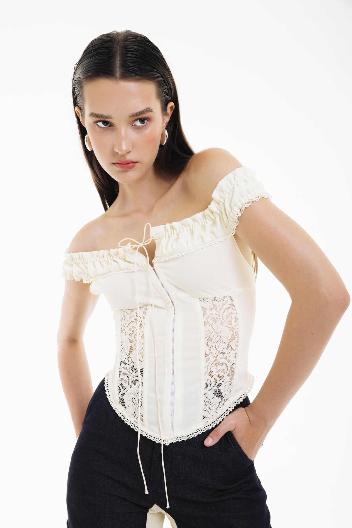 Delicate yet empowered, the SHADOWPLAY LACE CORSET bodice combines romantic lace with structured off-shoulder ruffles, creating a piece that is both ethereal and architectural.