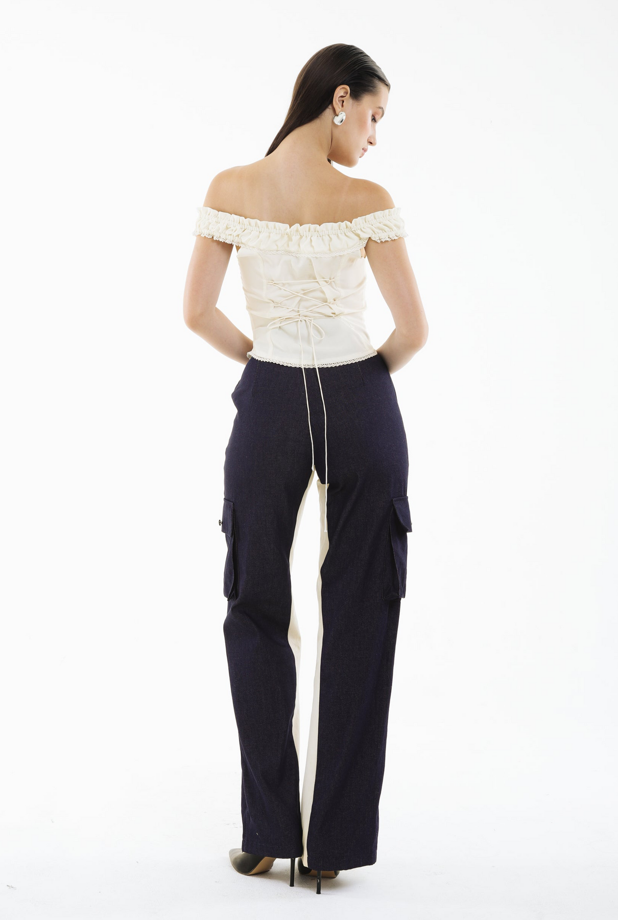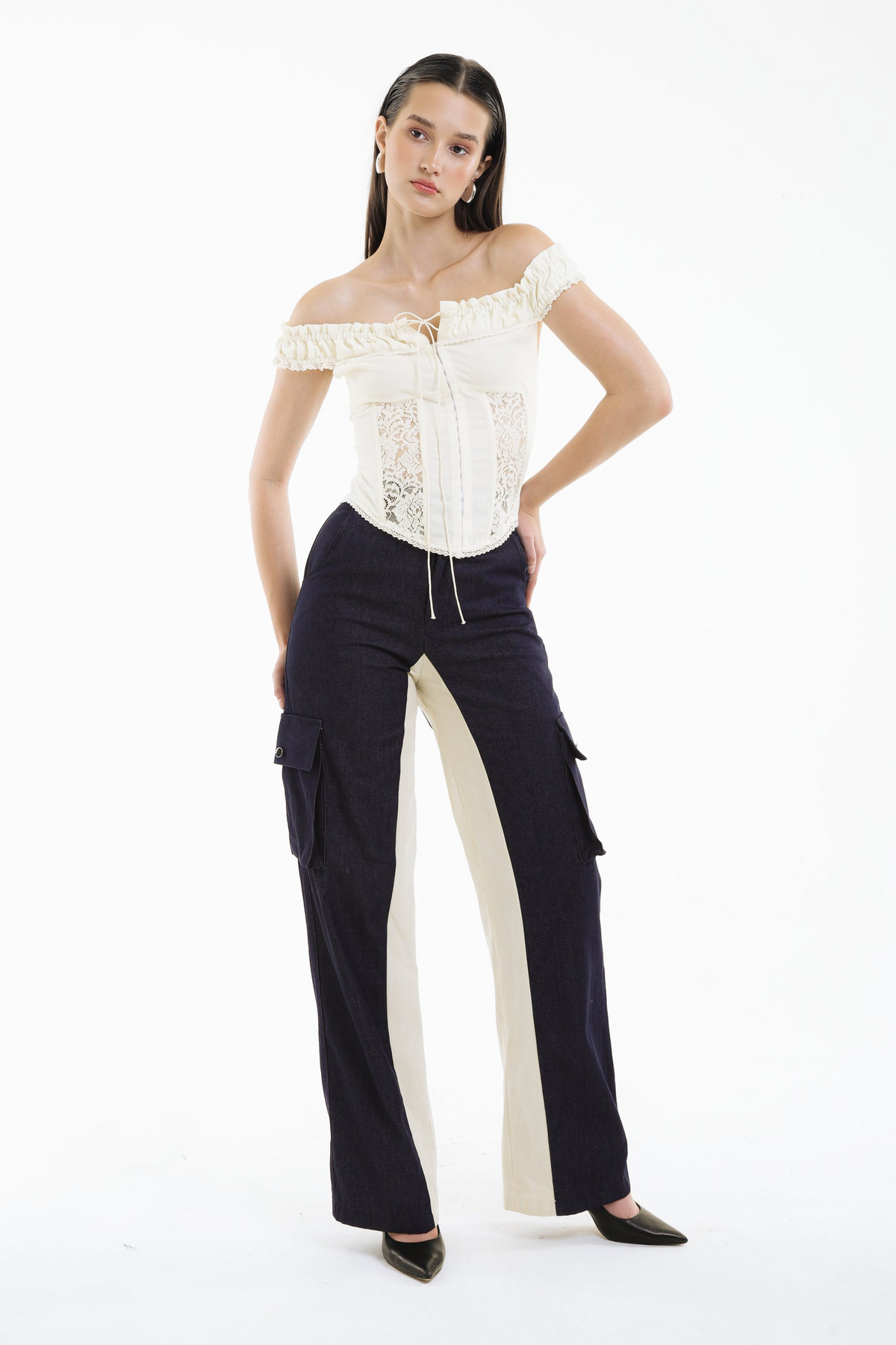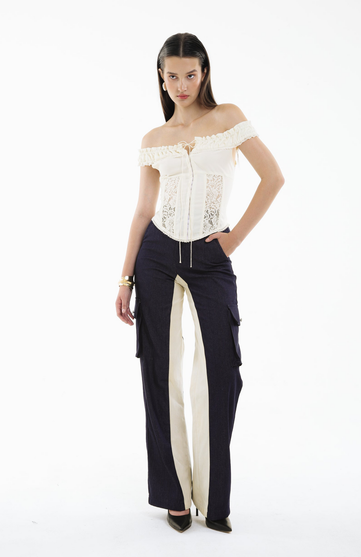 Delicate yet empowered, the SHADOWPLAY LACE CORSET bodice combines romantic lace with structured off-shoulder ruffles, creating a piece that is both ethereal and architectural.